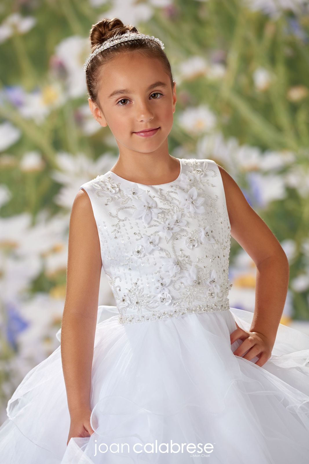 Sleeveless satin and tulle ball gown flower girl dress features jewel neckline, satin bodice with beading and organza flower accents, beaded belt at natural waist, crystal buttons along zipper back, ruffled tulle tea length skirt.