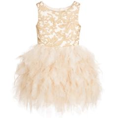 Girls gold jacquard dress with tulle skirt by Kate Mack & Biscotti. This opulent style has a fitted, sleeveless bodice, with a gold jacquard weave over a fine mesh fabric. The waist is decorated with pearls and it has an attached tulle skirt, with layers of gold and ivory tulle strips, that have a full and frothy effect. It fastens at the back with a zip, has a tulle waist tie and is lined in satin.