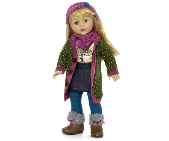 18-inch Sweater Dressing, with blue eyes and long blonde hair, looks winter glam in a knee-length purple sweater, with three buttons, magenta trim and a matching scarf. It’s worn over a white shirt that features a green tree, graphic print. A denim skirt, with a tan stitching detail, looks smashing with the sweater. Blue leggings and brown, fur lined, ankle boots, with pink laces, and a headband that matches the sweater completes Sweater Dressing’s cool look.